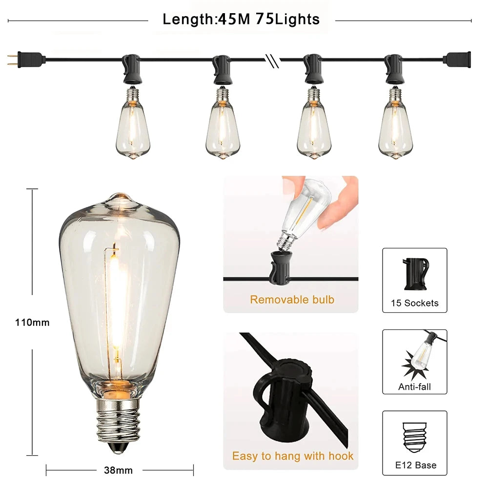 Create a festive and inviting atmosphere with these Outdoor String Light ST38 Patio Hanging Lights. Designed for use in gardens, backyards, porches, and other outdoor spaces, these LED string lights feature durable, shatterproof plastic bulbs for safety and long-lasting enjoyment. Their warm glow adds charm to parties and gatherings while withstanding outdoor elements. Easy to hang and energy-efficient, they are perfect for enhancing your outdoor celebrations with style and reliability.
